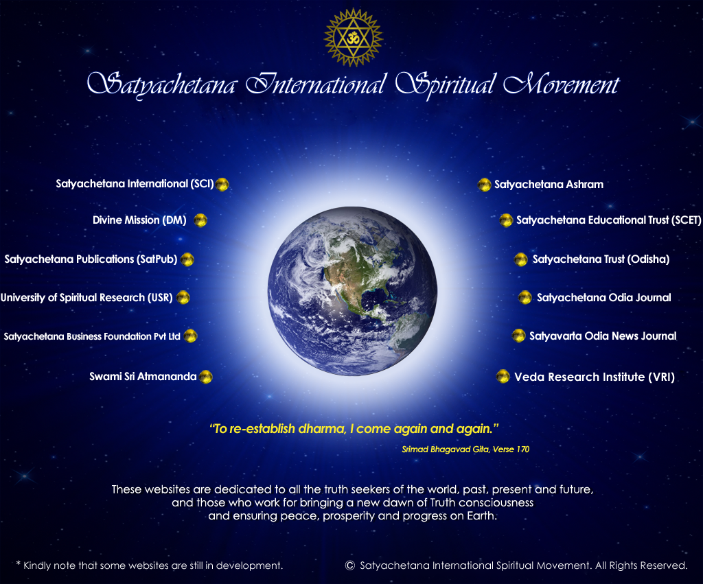 Satyachetana International Divine Mission Satyachetana Publication University of Spiritual Research Founder of Satyachetana Movement Satyachetana Business Foundation Satyachetana Ashram Satyachetana Educational Trust Satyachetana Odisha Trust Satyachetana Odia Journal Satyavarta Oriya Journal Veda Research Institute